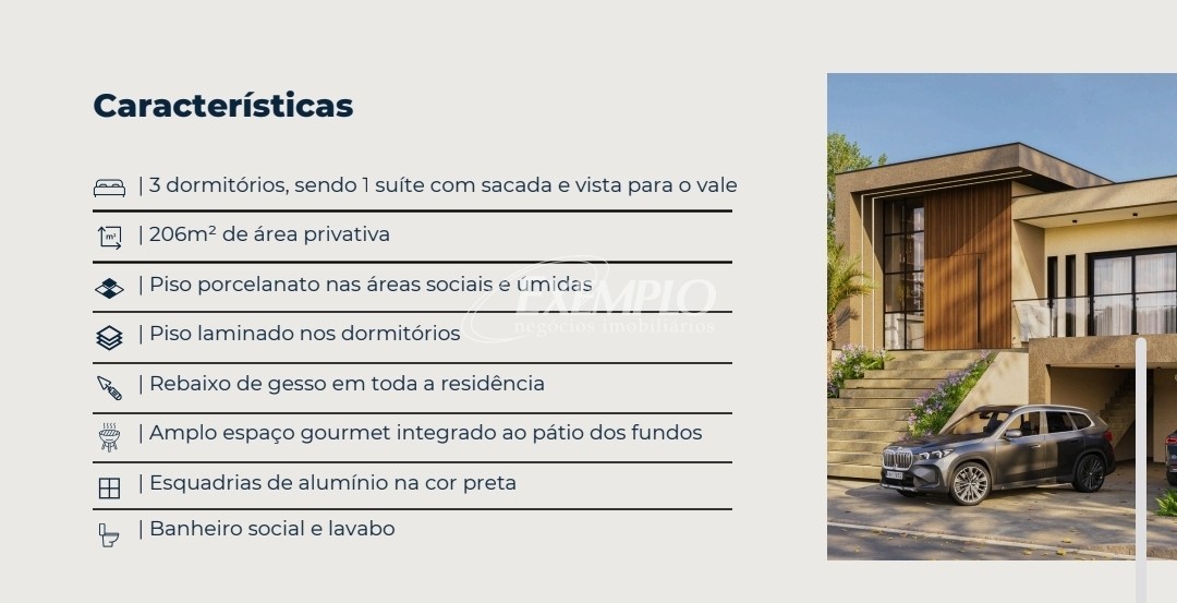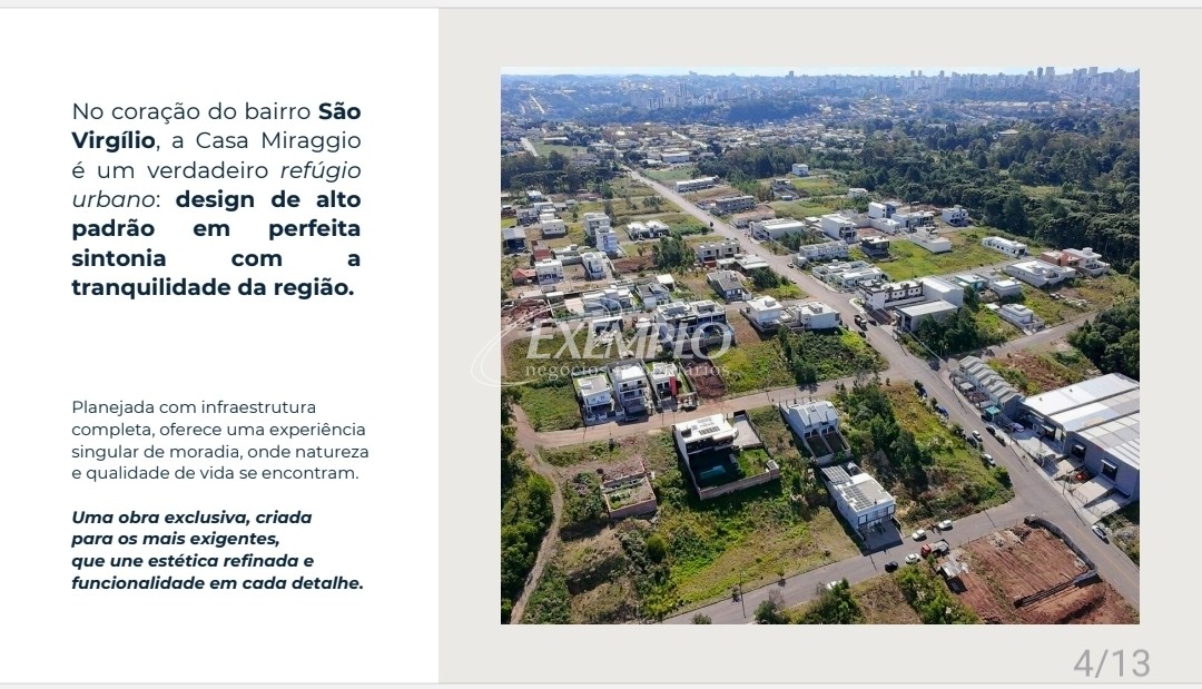 Descrição › Localizada no bairro São Virgílio, em Caxias do Sul, esta casa de 3 dormitórios, sendo 1 suíte, é ideal para quem busca conforto e praticidade. Com 206m² de área privativa, possui esquadrias em PVC, churrasqueira, garagem fechada para 2 carros, pátio e uma vista panorâmica encantadora. Além disso, conta com acabamentos de qualidade, como rebaixo em gesso, vidro duplo e espera para split. Com uma localização privilegiada e todas as comodidades que você precisa, esta casa é perfeita para quem busca um lar acolhedor e funcional.